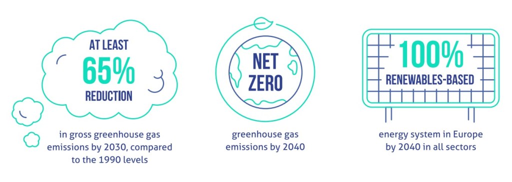 As metas do PAC son máis ambiciosas que as actuais da UE: polo menos -65% de emisións brutas de gases de invernadoiro en 2030 (máis de 10 puntos menos) e emisións netas cero en 2040 (dez anos antes da meta oficial).